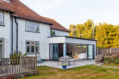 The scheme creates the opportunity to create high quality architecture being traditional where necessary and contemporary where appropriate. A distinct two-stage design approach was adopted. The two-storey element is of traditional design to fit in with the existing building, ensuring a consistent appearance when approaching the house. The single storey element to the rear of the house is of unashamedly contemporary appearance, finished in white render with bi-fold doors to create an excellent relationship with the rear garden, and introduces light and air to the living accommodation.